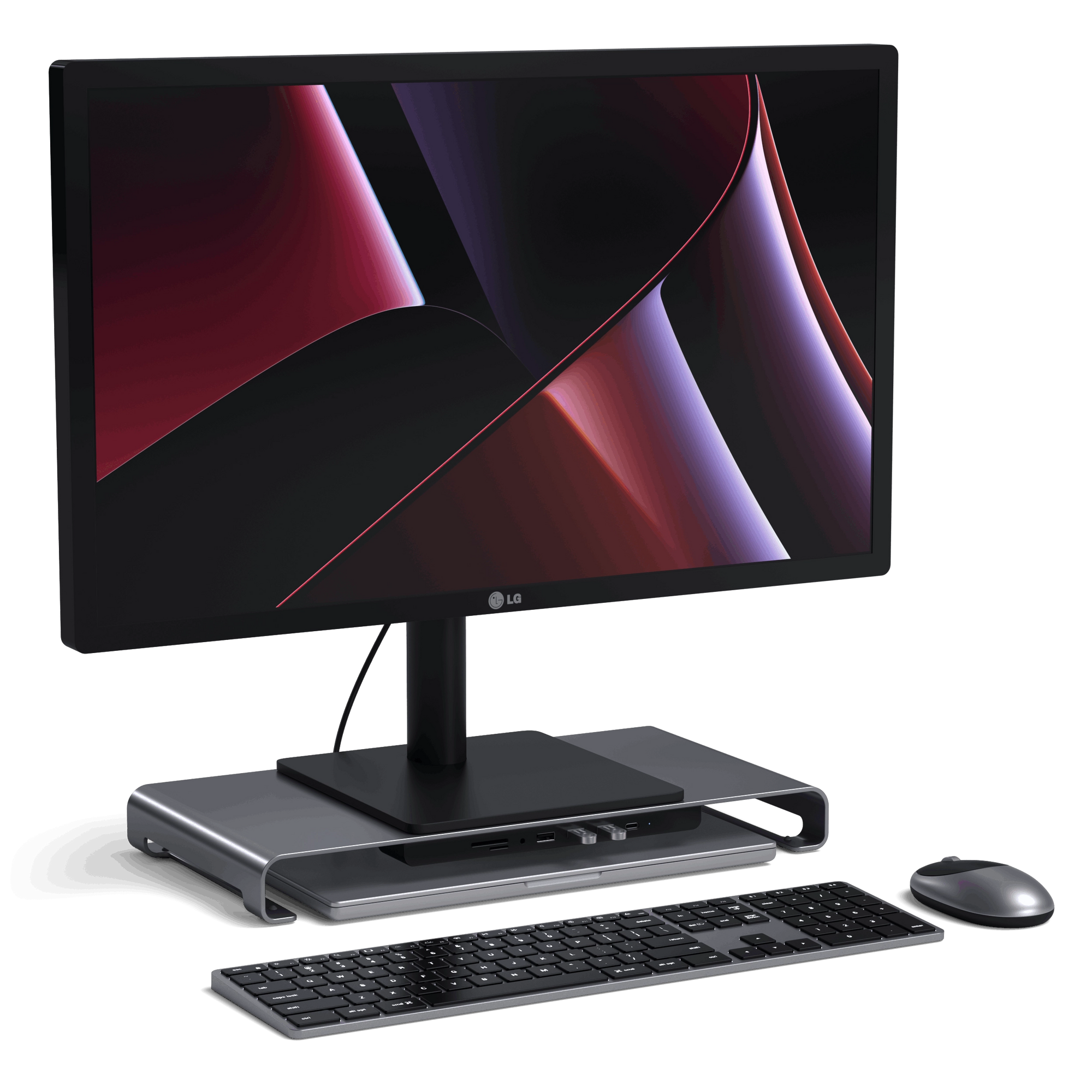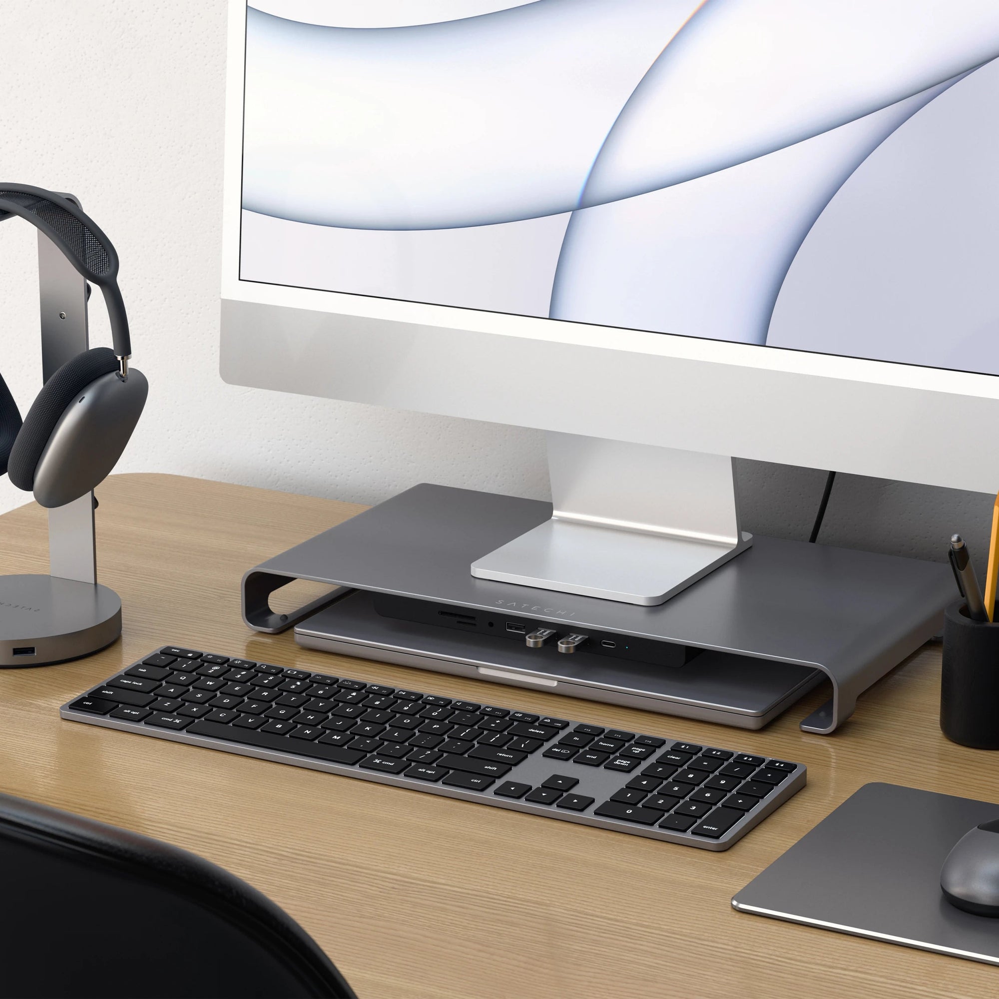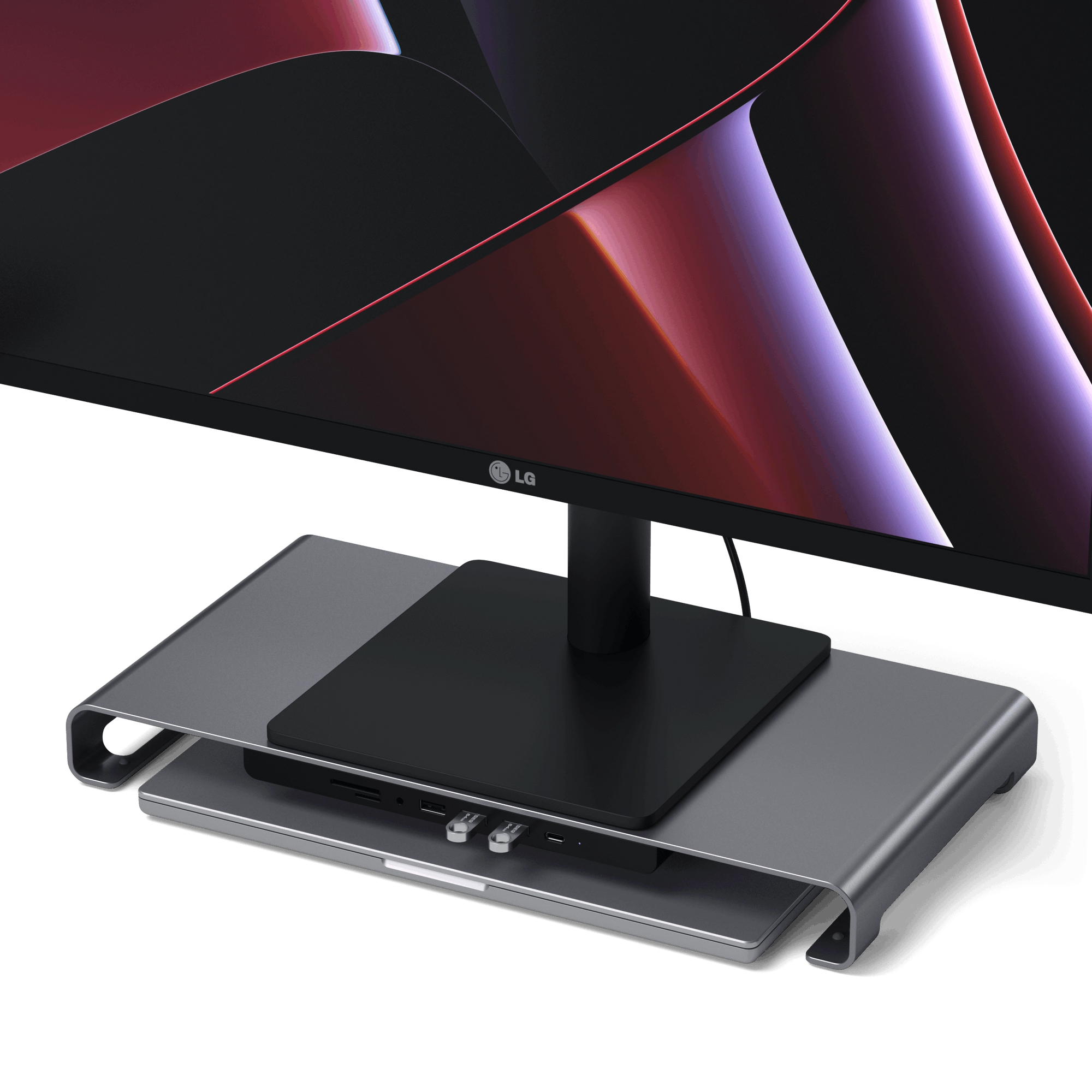 The USB-C Monitor Stand Hub XL features a aluminum finish to complete your modern desk setup.